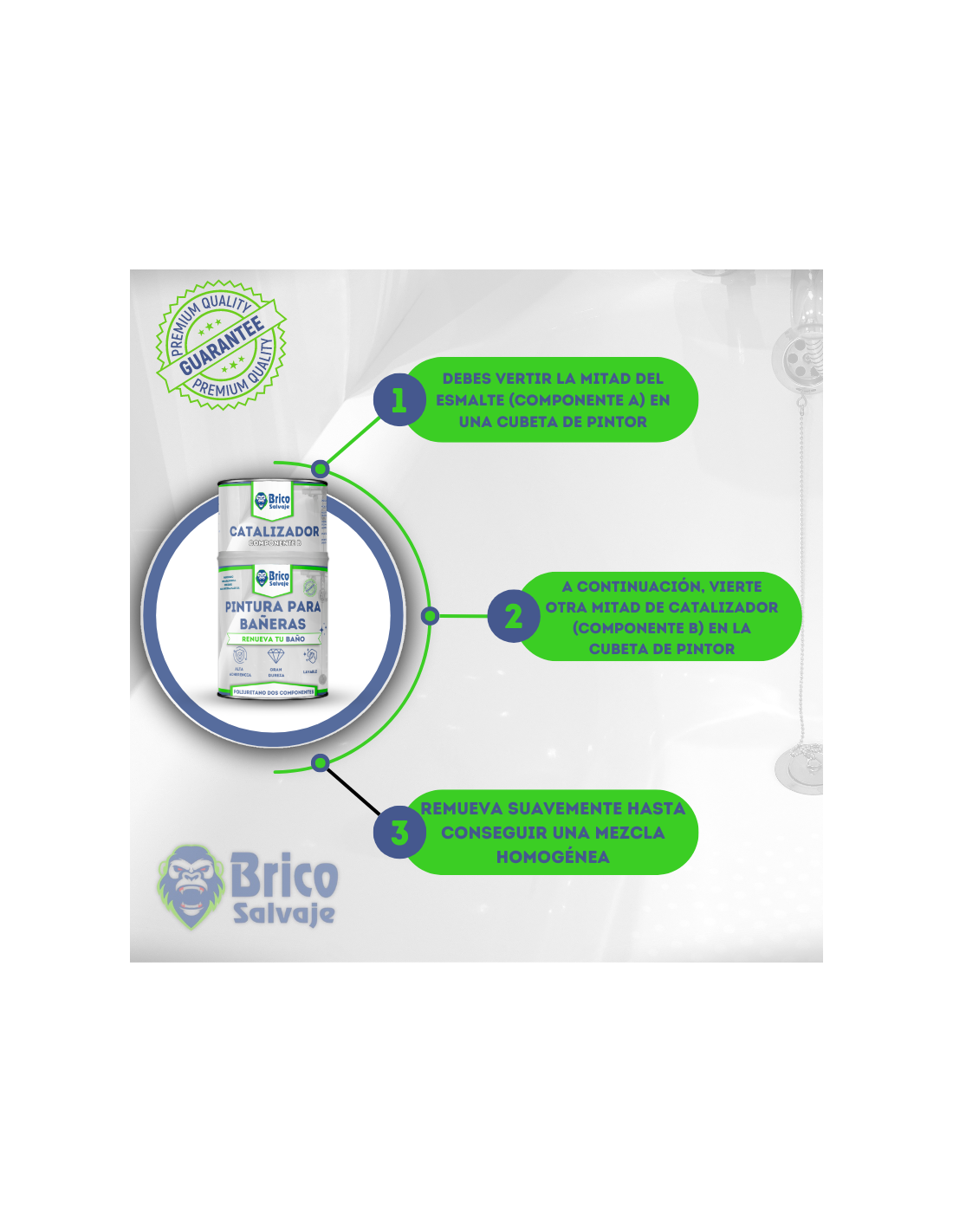 A Tinta para Banheiras Fosca 600ml + 150ml Bricosalvaje é uma solução inovadora e prática para renovar banheiras desgastadas sem substituir. Projetada para aderir a porcelana, fibra de vidro e acrílico, oferece cobertura duradoura e resistência à água, mantendo a aparência fresca e limpa por muito tempo. Com alta resistência a produtos de limpeza e uso diário, oferece uma camada protetora contra desgaste e manchas.